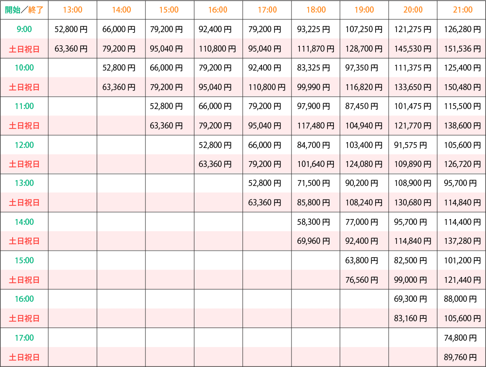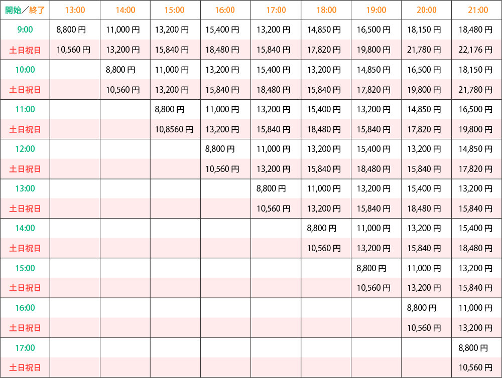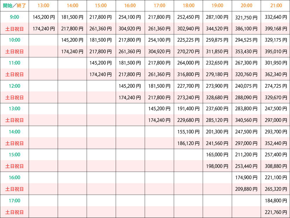 | 17:00~21:00 | 1時間 18,700円 (税抜 17,000円) |